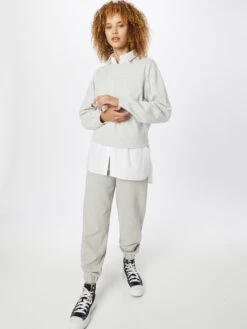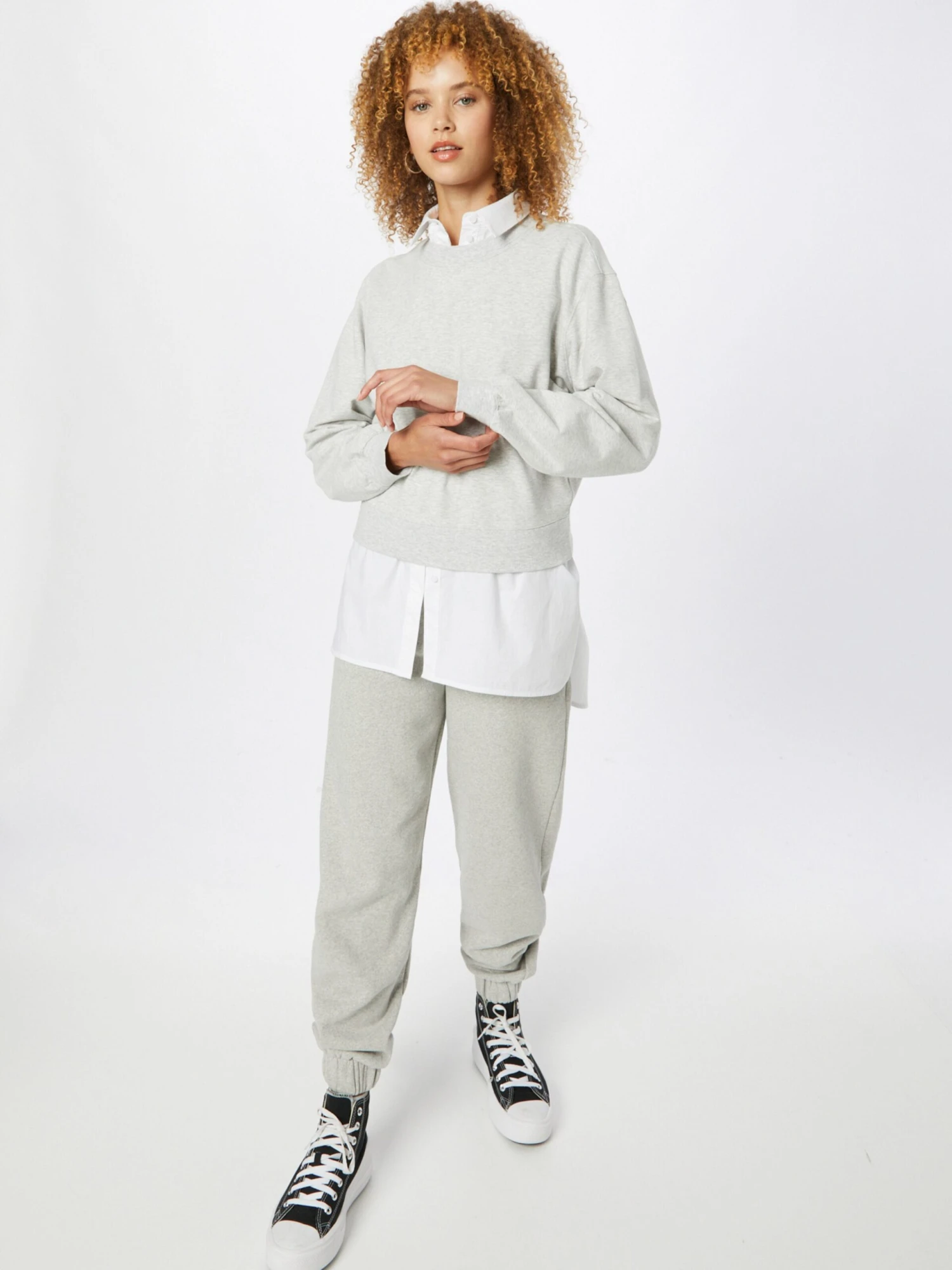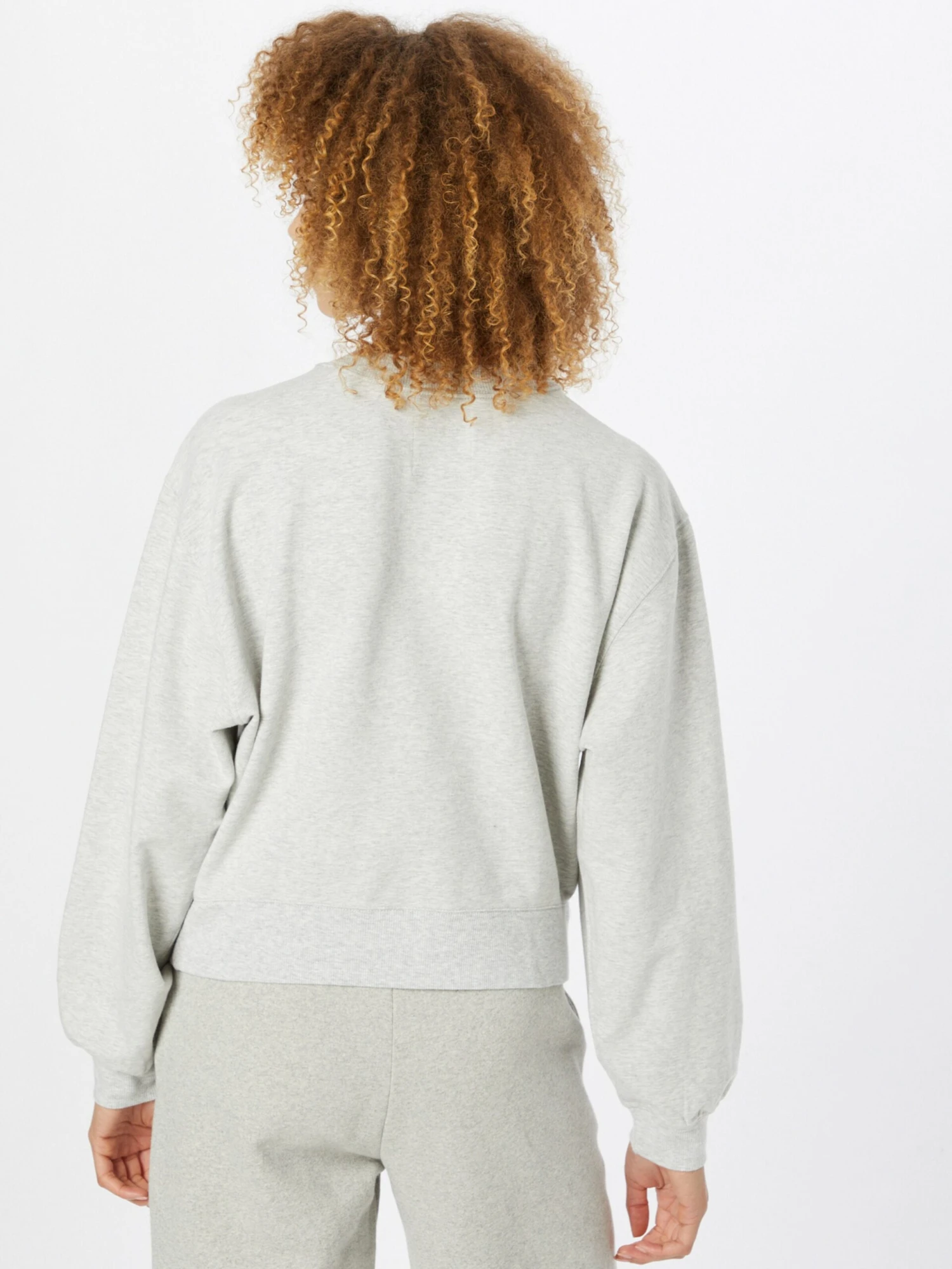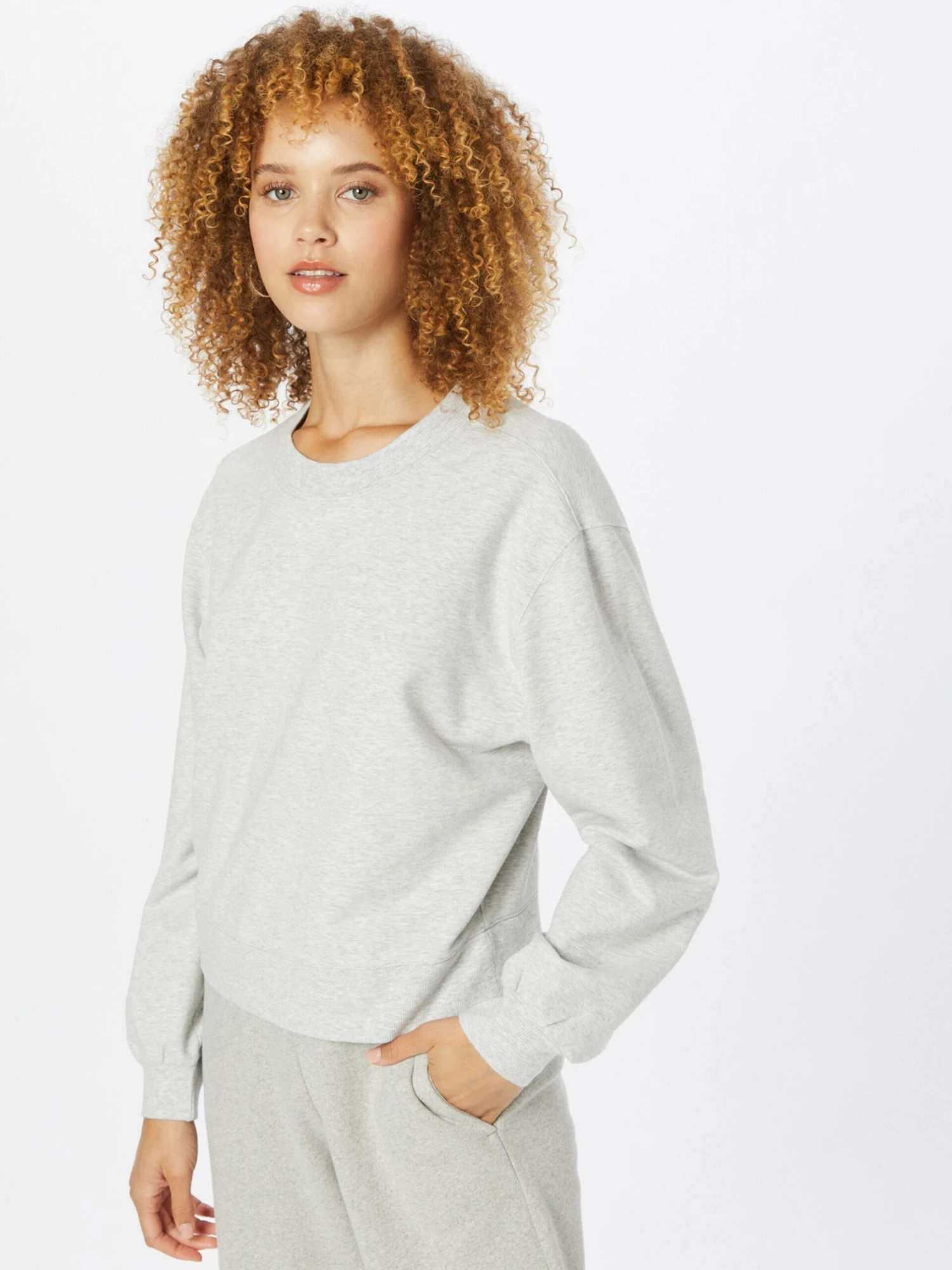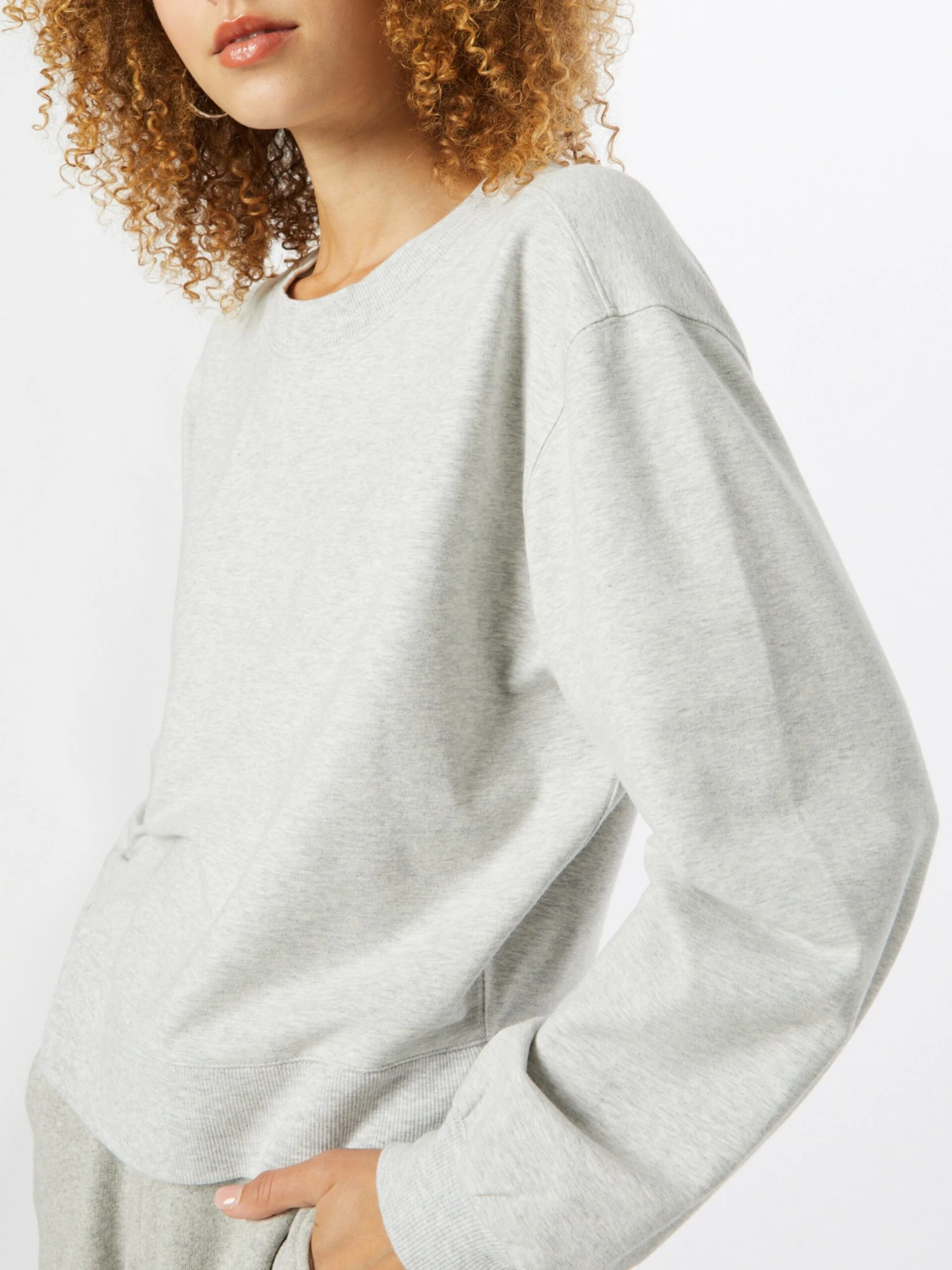 MélangeSweatstofRonde halsGeribbelde kraagRechte zoomGeribd ceintuurtjeOvercut schouderNektapeOp staal nadenVoelt zacht aan