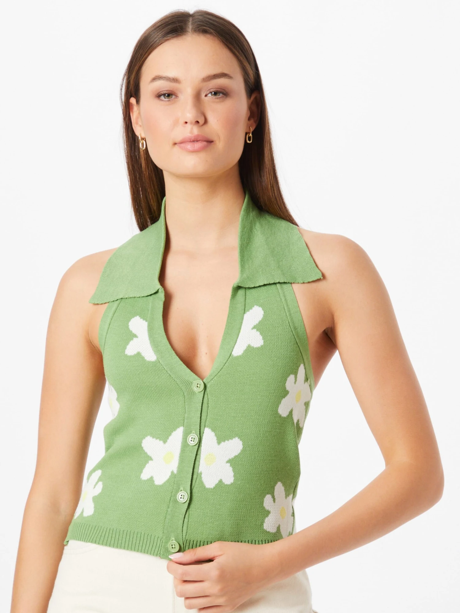 BacklessGeribbelde kraagKnop placketGeribd ceintuurtjeDiepe snit/decolletéTurn-down kraagFully fashionedJacquard patroonMet textuurVoelt zacht aan