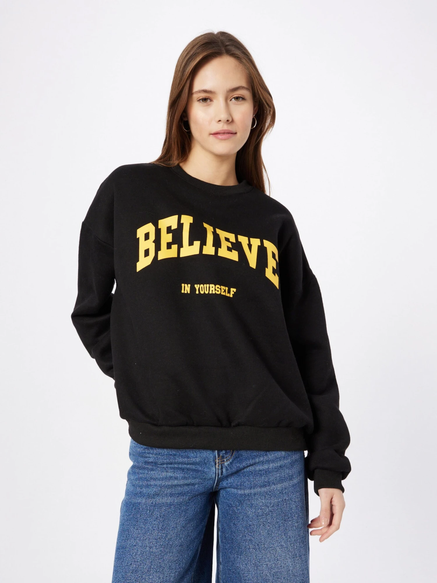 MottoprintSweatstofRonde halsGeribbelde kraagRechte zoomGeribd ceintuurtjeOvercut schouderOp staal nadenVoelt zacht aan