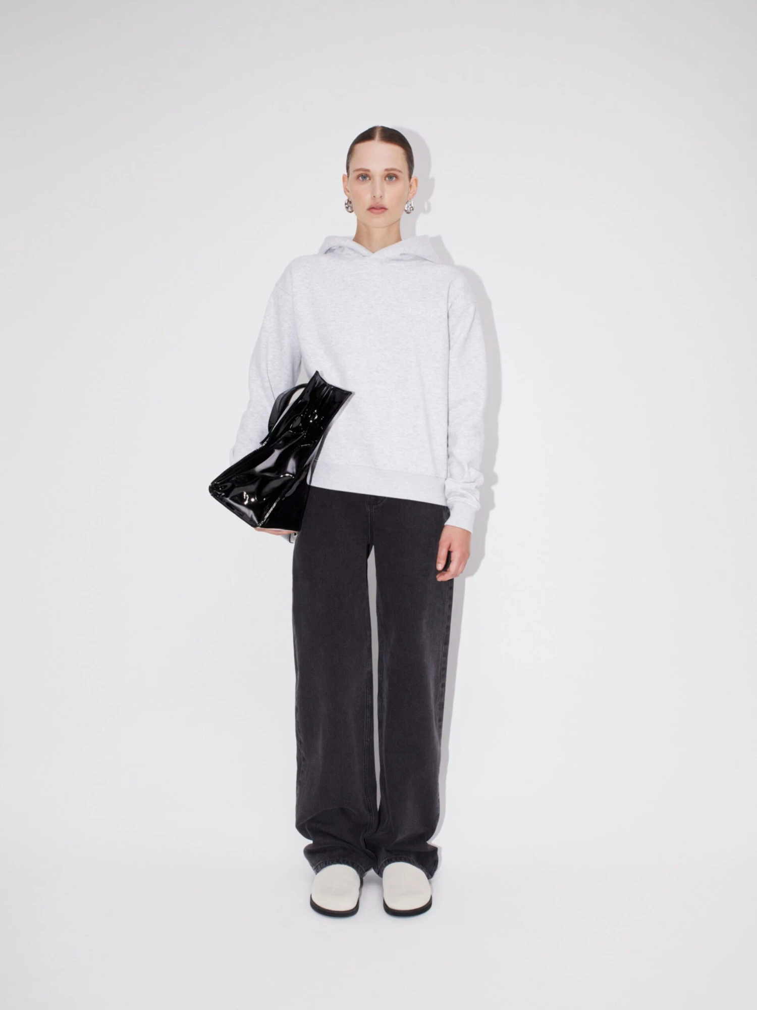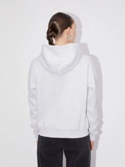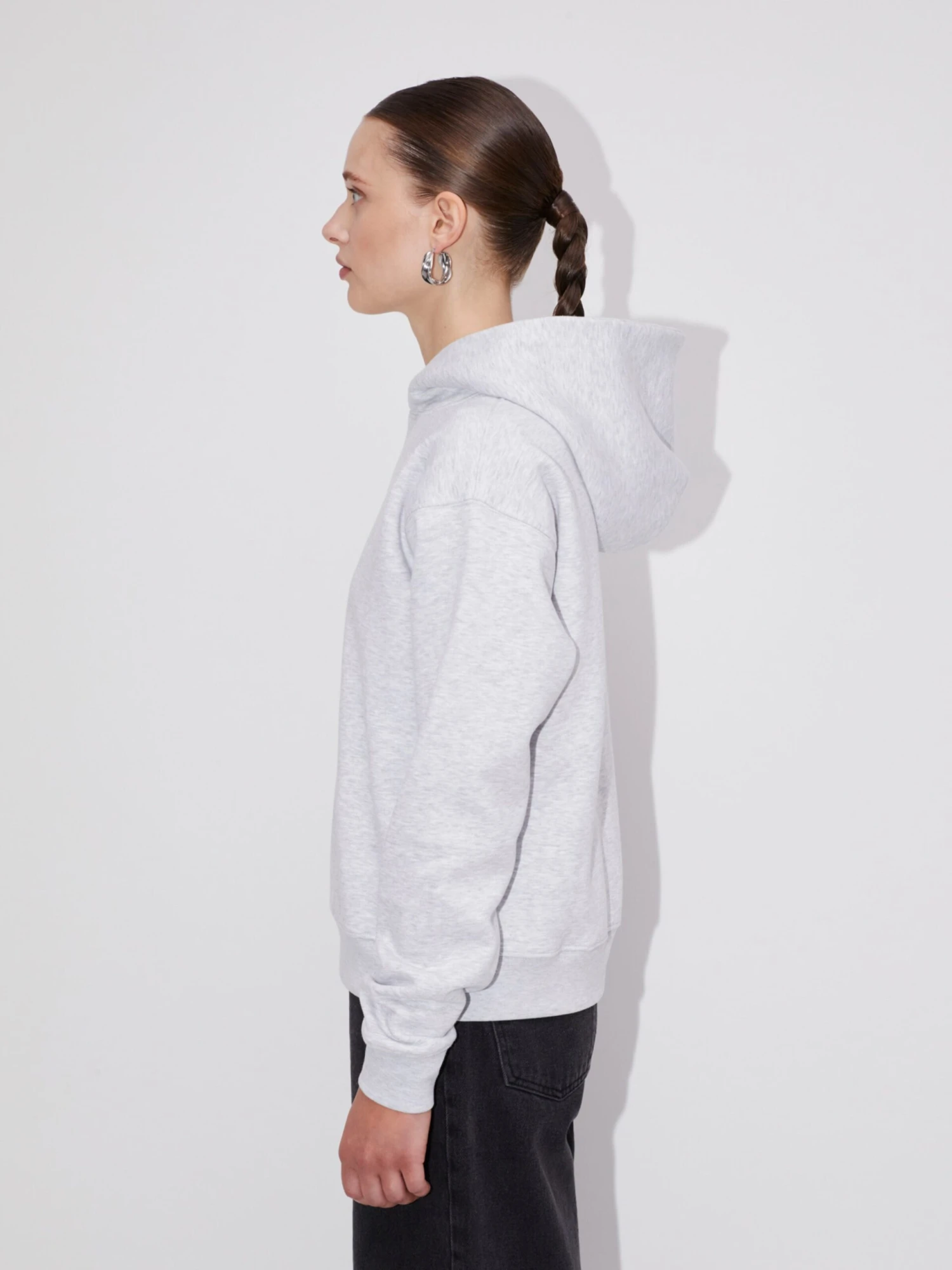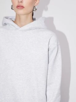 MélangeSweatstofCapuchonRechte zoomGeribd ceintuurtjeOvercut schouderNektapeOp staal nadenVoelt zacht aan