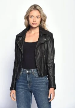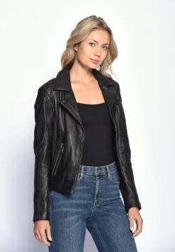 EffenLeerBikerjackMouw ritsRevers kraagVeteringDeelnadenRitszakken aan de zijkantSchuine ritsStikselsOp staal nadenLabel preegdrukGladde stofLamsleerMetalen oogjesLicht gevoerd