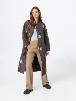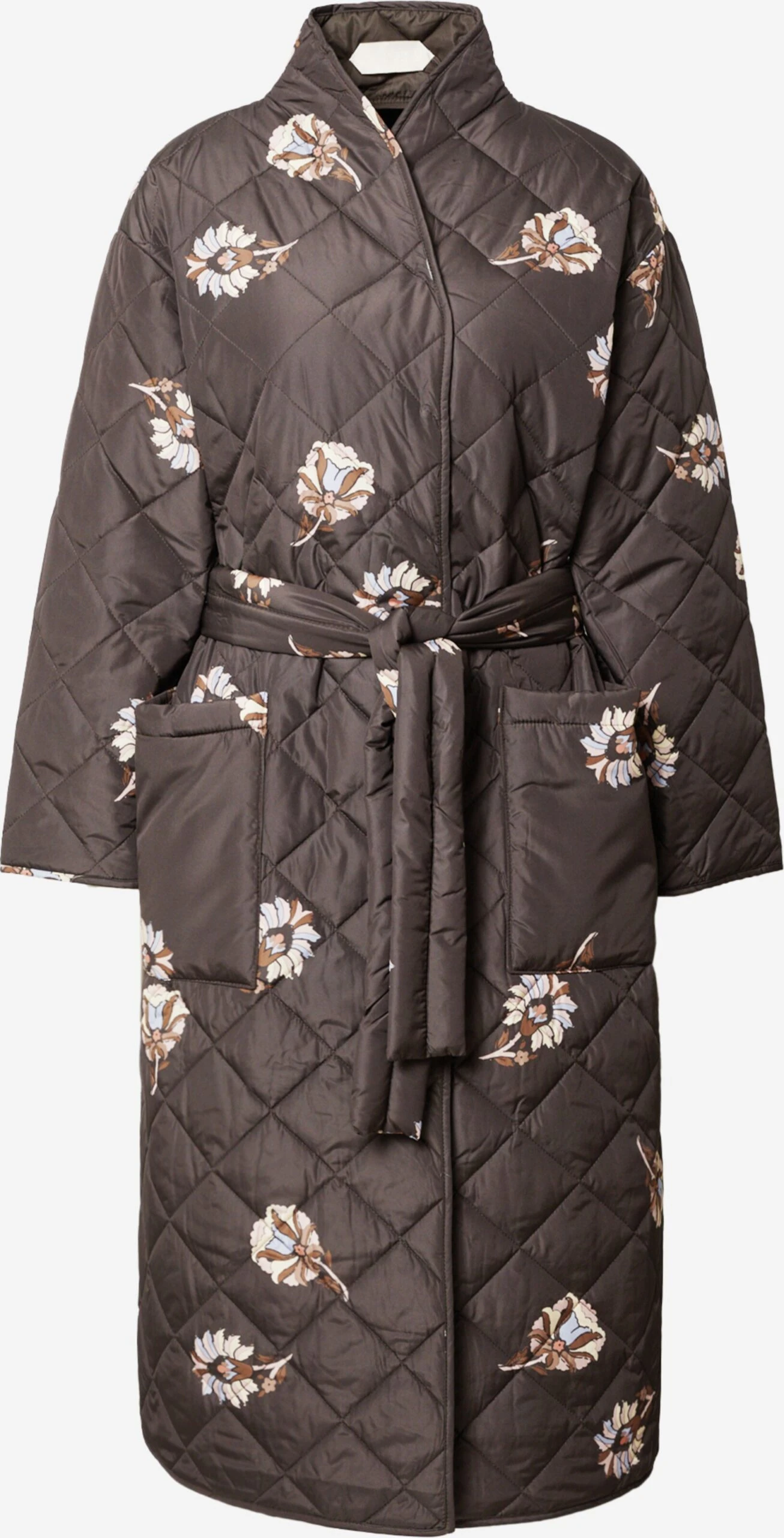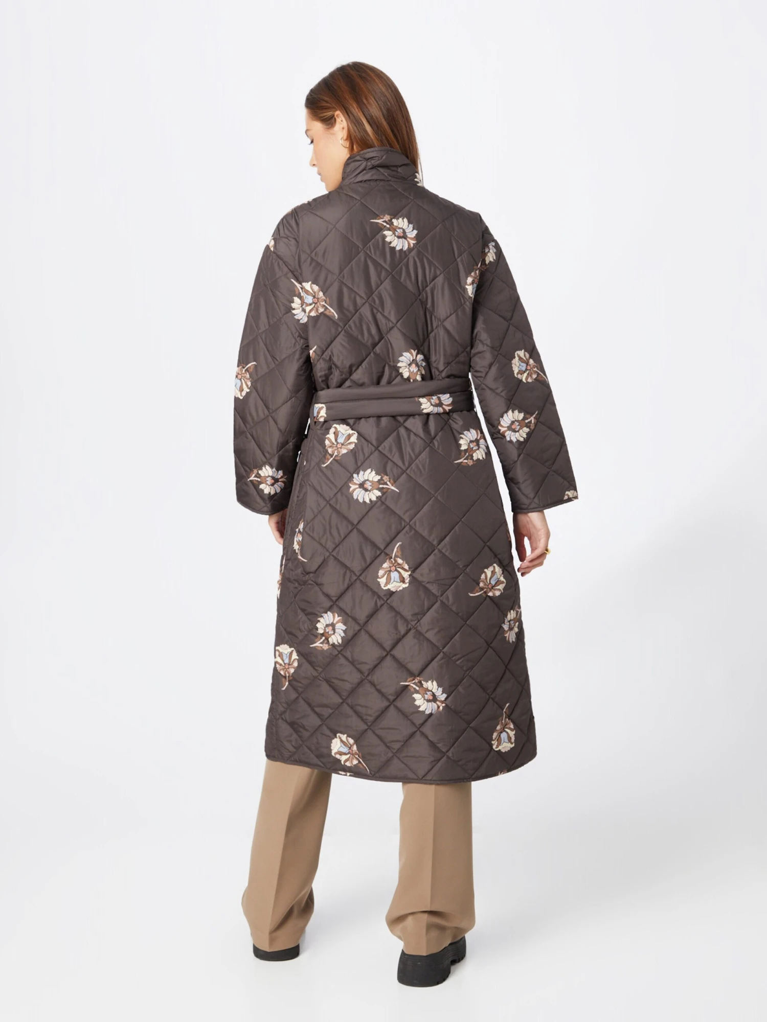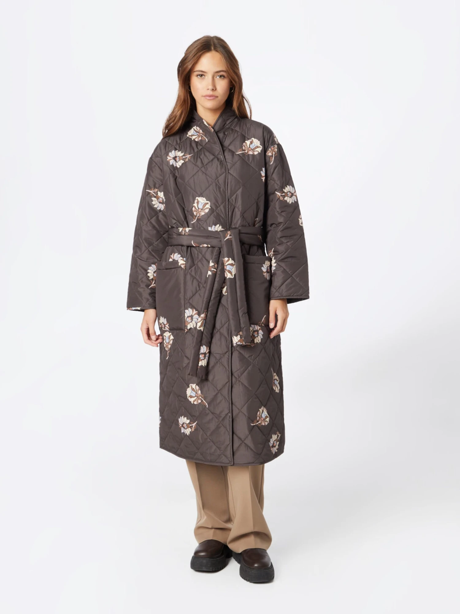 BloemenprintGewatteerde jasStaande kraagTaillebandOvercut schouderOpgezette zakkenAll-over patroonStikselsVaste gripLicht gevoerdDrukknoop