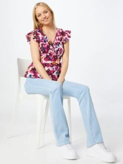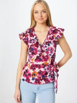 BloemenprintJerseyBrede bandjesV-halsRuchesVolantWikkel designGevoerde zoom/randOm te knopen/bindenIngelegde kraagAll-over patroonVoelt zacht aan