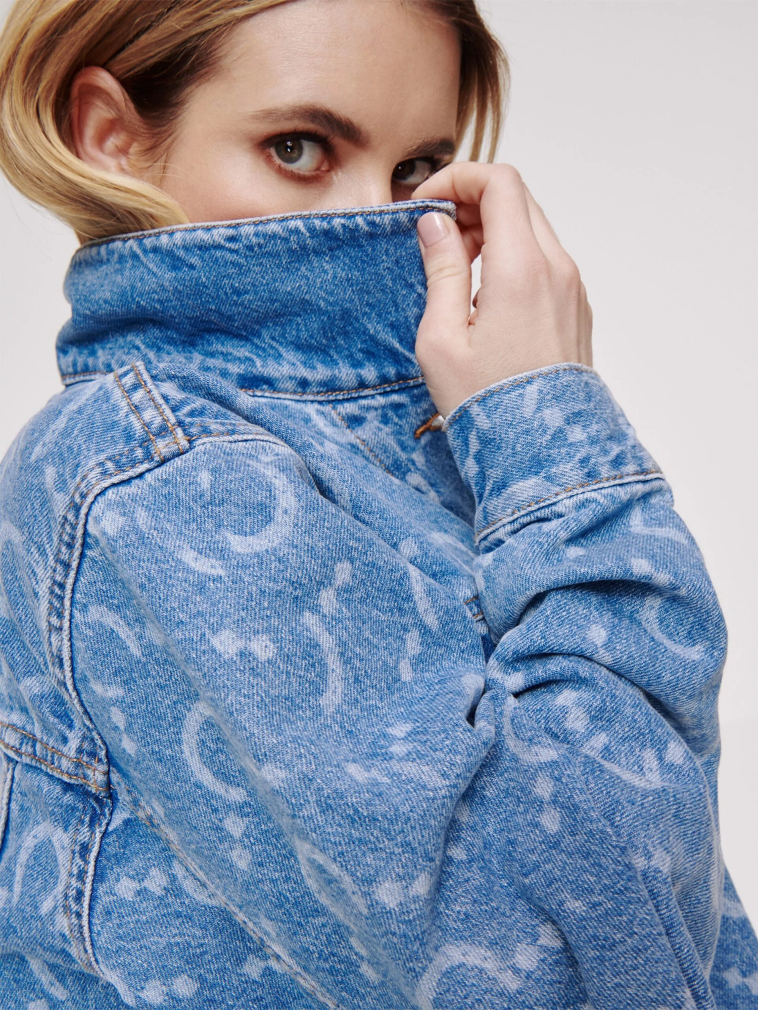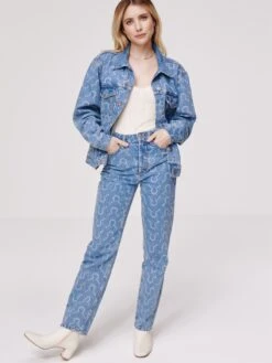 Denim1-knoops manchettenRechte manchettenKnop placketOvercut schouderTurn-down kraagBorstzakZakken aan de zijkantAll-over patroonStevige stofNiet gevoerdKnoopsluiting