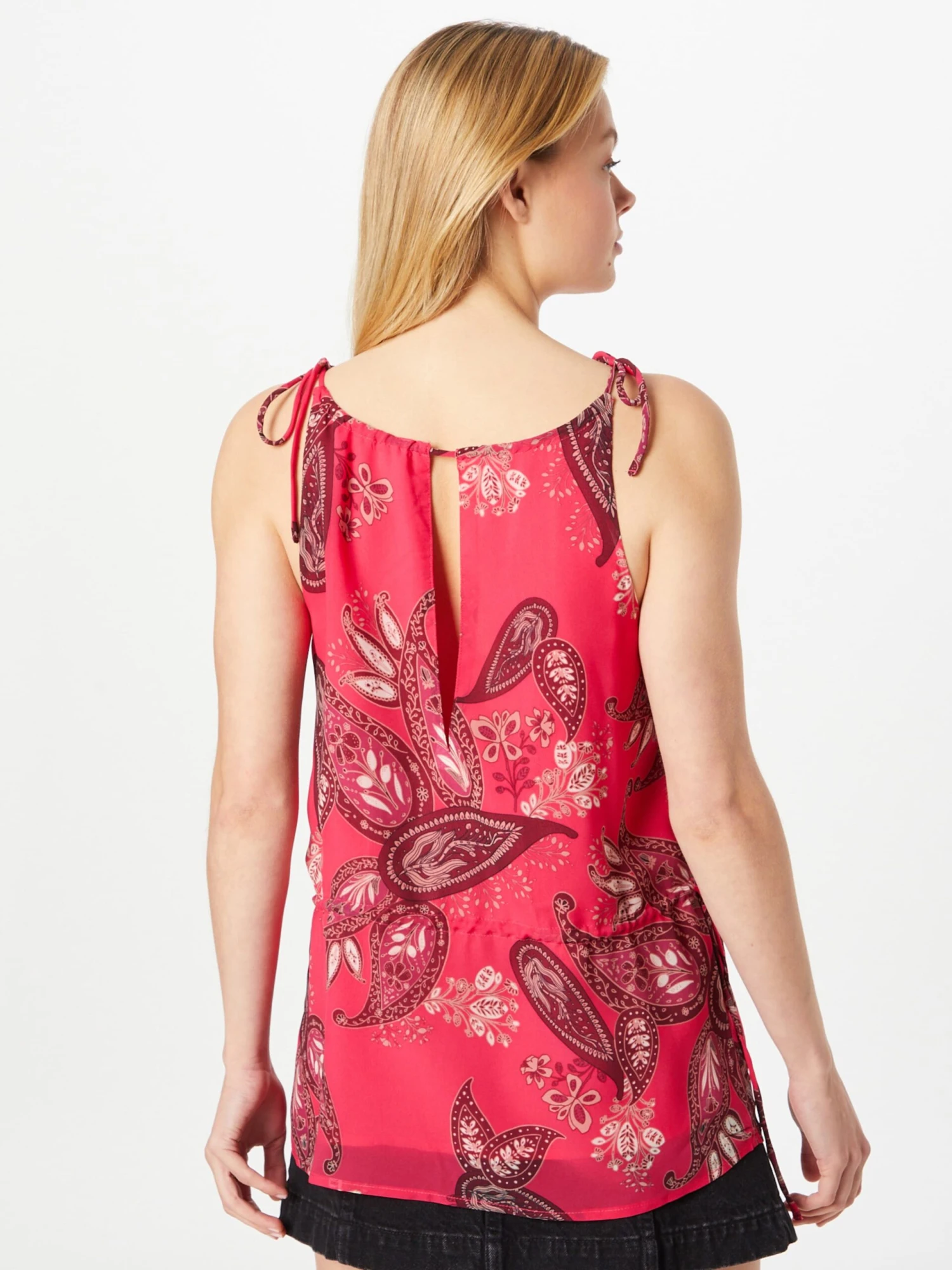 PaisleyRonde halsZonder kraagCut-outsGedrapeerdGevoerde zoom/randRechte zoomOm te knopen/bindenVerstelbare tailleAll-over patroonGladde stofBlouseshirt