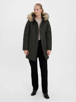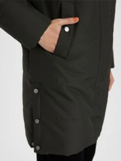 EffenGewatteerde jasDrukknopenGevoerde capuchonCapuchon met opstaande kraagVerborgen ritsZakken aan de zijkantOp staal nadenGladde stofWarm gevoerdRitssluiting