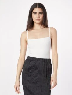 EffenJerseySpaghettibandjesCarréhalsGevoerde zoom/randRechte zoomGeribbeld gebreidOp staal nadenVoelt zacht aan